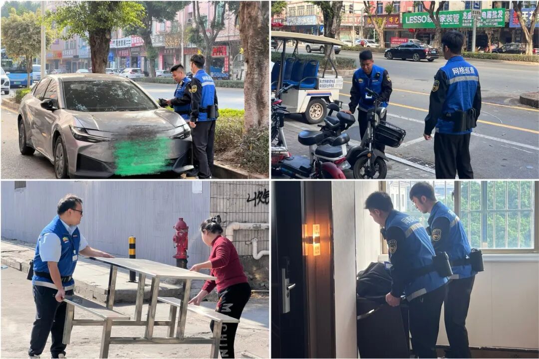 网格管理员来到辖区内占道经营严重区域,对沿街商铺、出租屋存在电动车乱停乱放、衣物随地晾晒等现象进行挪动并摆放整齐,保障市容整洁。其次,对场所负责人进行宣传并积极劝导。同时,在走访出租屋的巡查中,当遇到楼道堆积的旧家具、废纸箱时,网格管理员则耐心的与租客沟通一起清理以及讲解安全隐患与文明建设的意义。